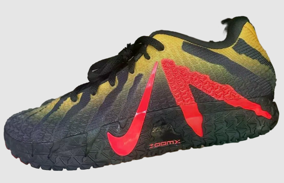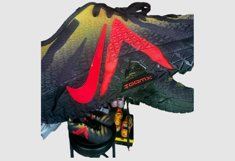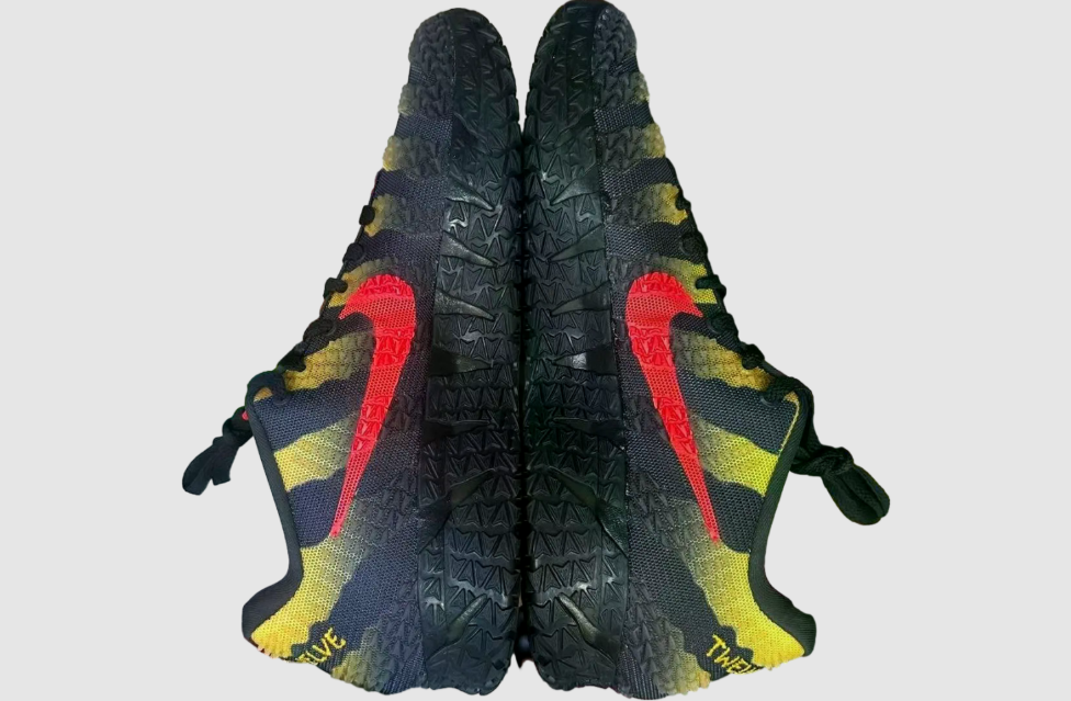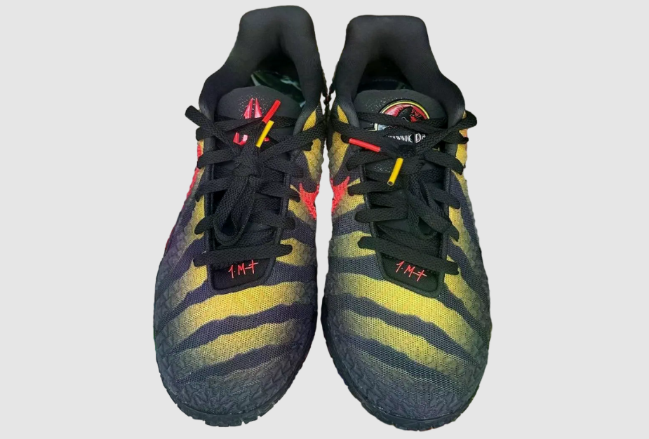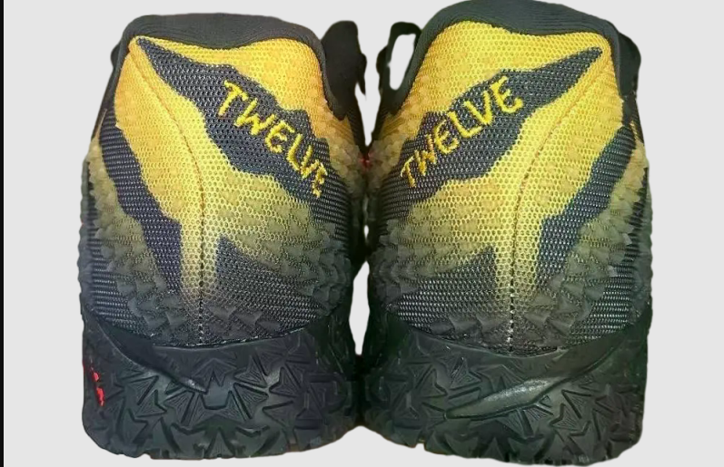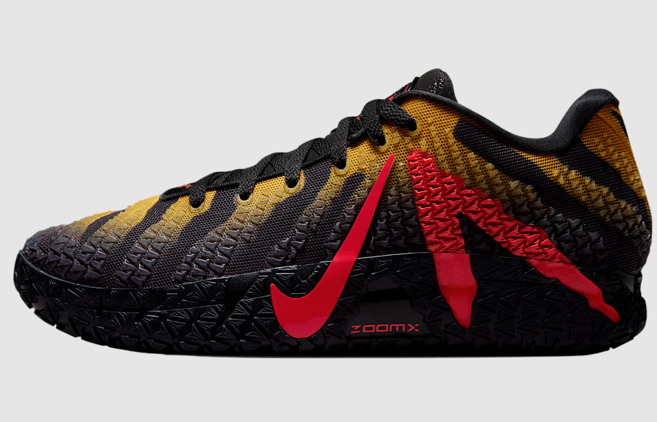 The Upper part is dressed in a stealthy Anthracite base; the shoe features striking Yellow Ochre claw marks that wrap around the lateral side, mimicking a raptor’s slash. It features a striking black and gold upper with a textured, wave-like pattern that gives it a dynamic and energetic look.