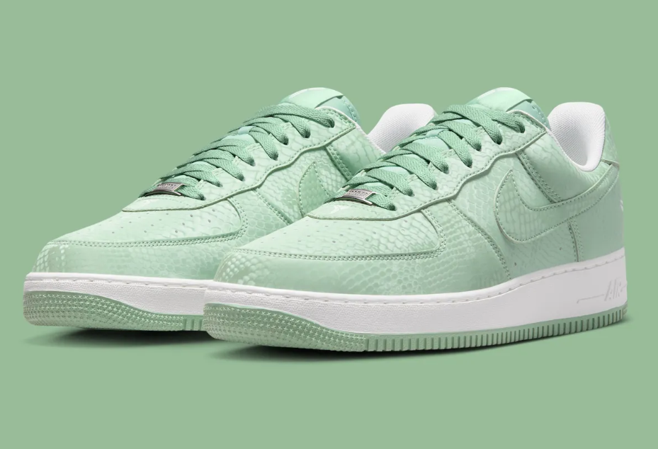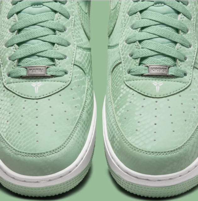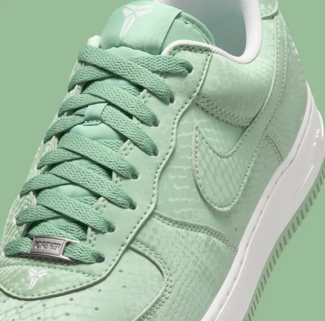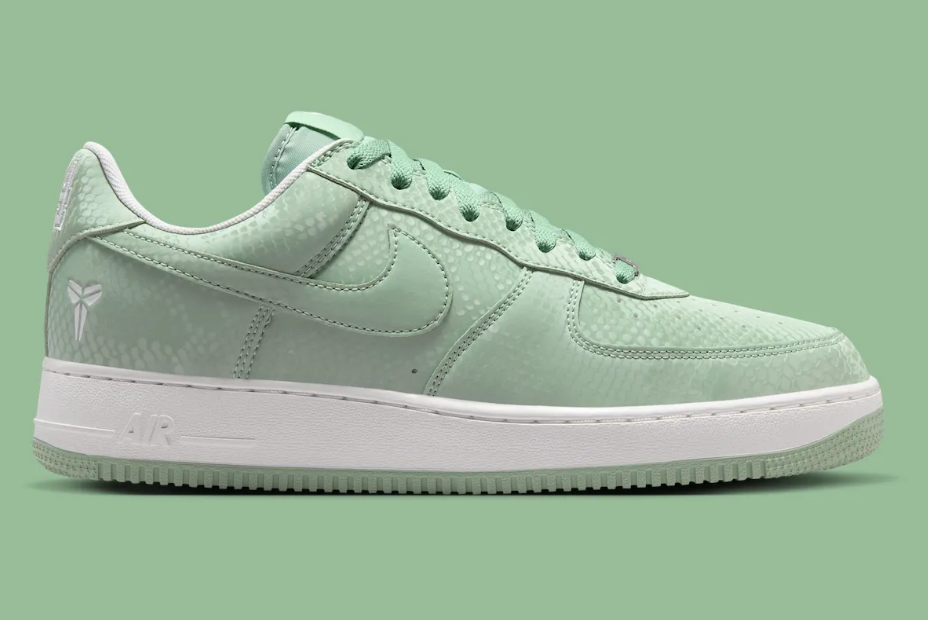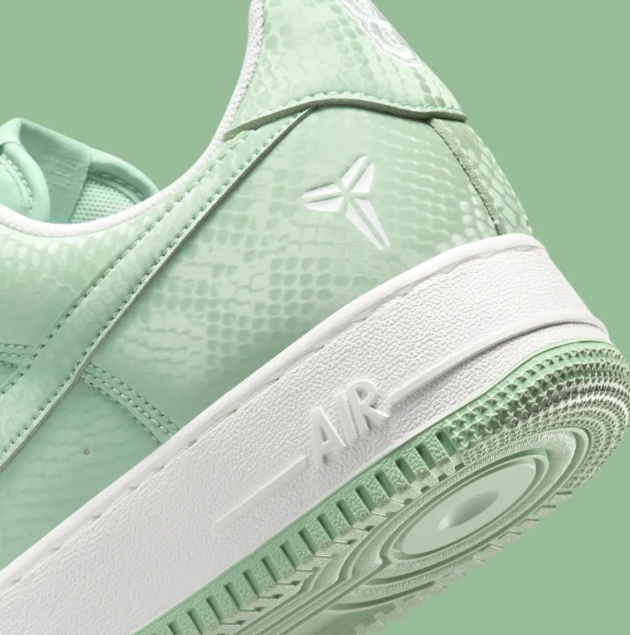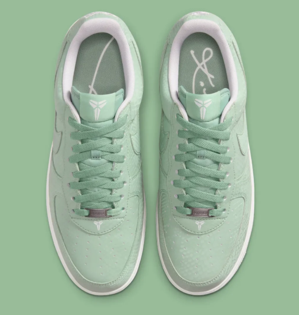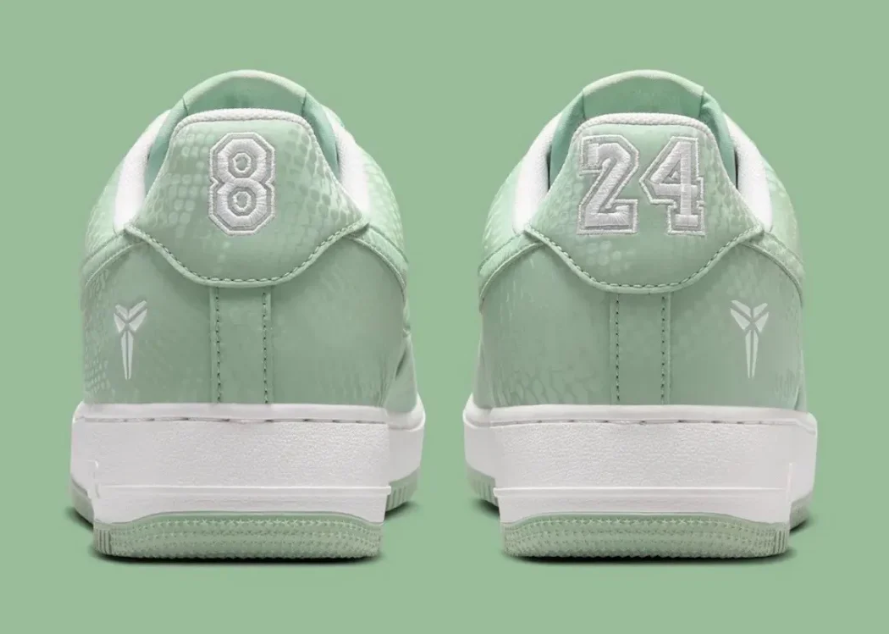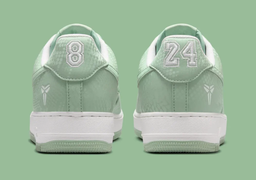 To balance the soft green upper, Nike has opted for Summit White on the Swoosh, the laces, and the branding. A crisp white midsole sits atop a matching “Steam” green outsole, featuring the classic AF1 pivot-circle tread for heritage traction. Every pair comes equipped with custom “Mamba Forever” lace dubraes, marking its status as an official commemorative release.